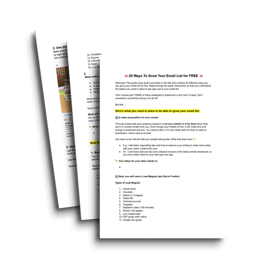 The 25 FREE ways to grow an email list that I’ve put together for you in this handy guide are all designed to work ORGANICALLY. Zero ads required. (AND without taking hours of your time every week).